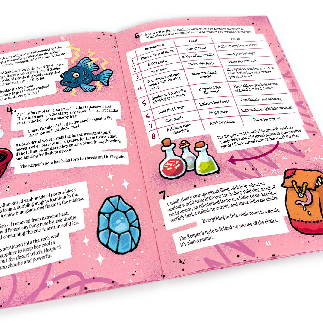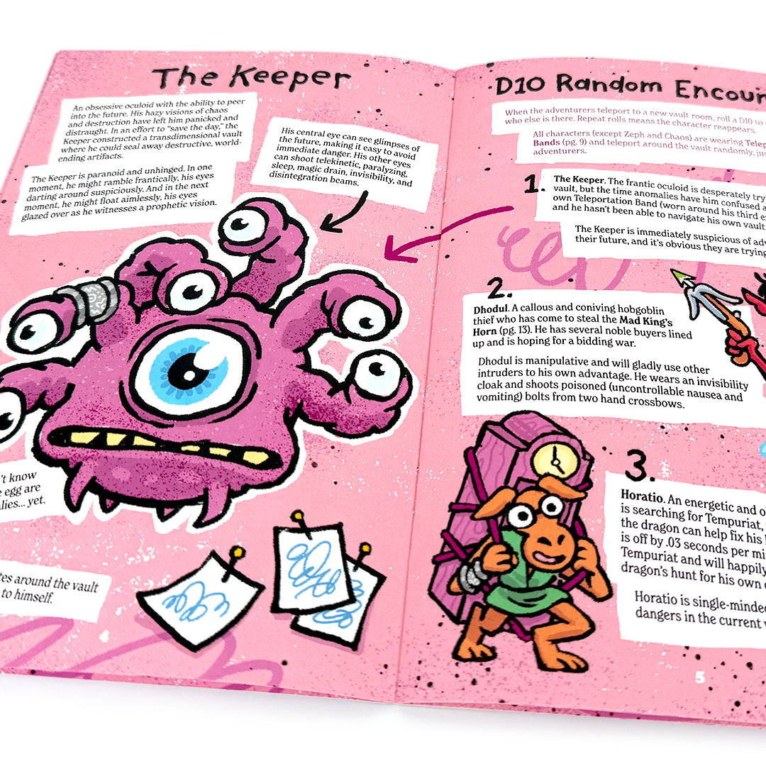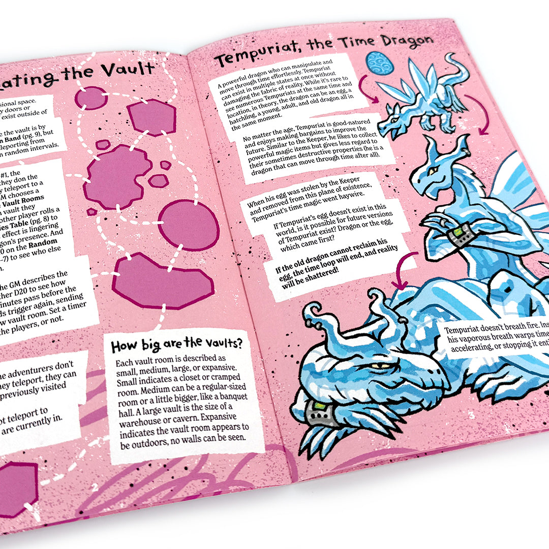 The Vault at the End of Time (FSG 34) is a chaotic one-shot dungeon filled with dangerous magic items, a paranoid beholder, and a time dragon! Adventurers will teleport throughout the transdimensional vault, trying to stop an apocalyptic event.